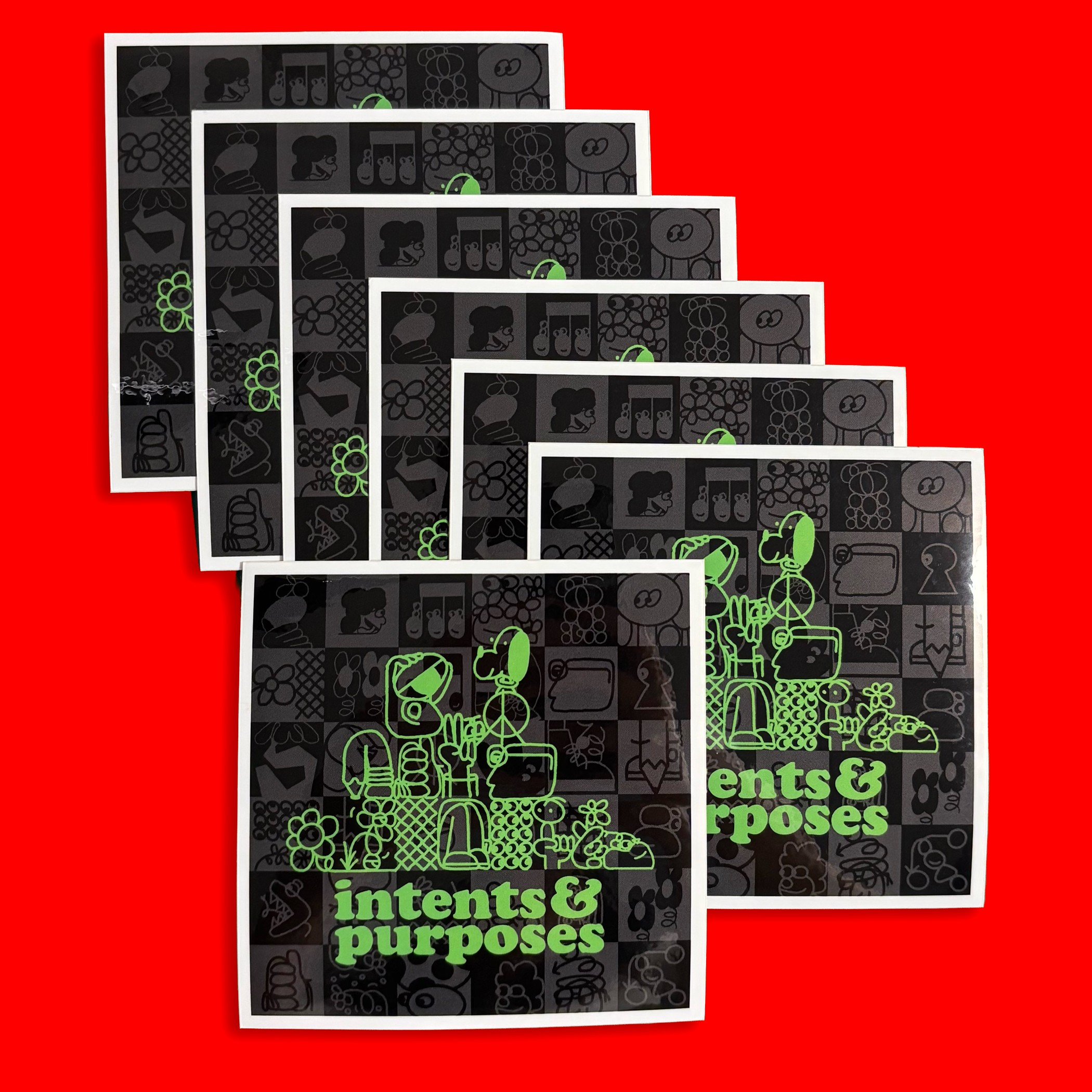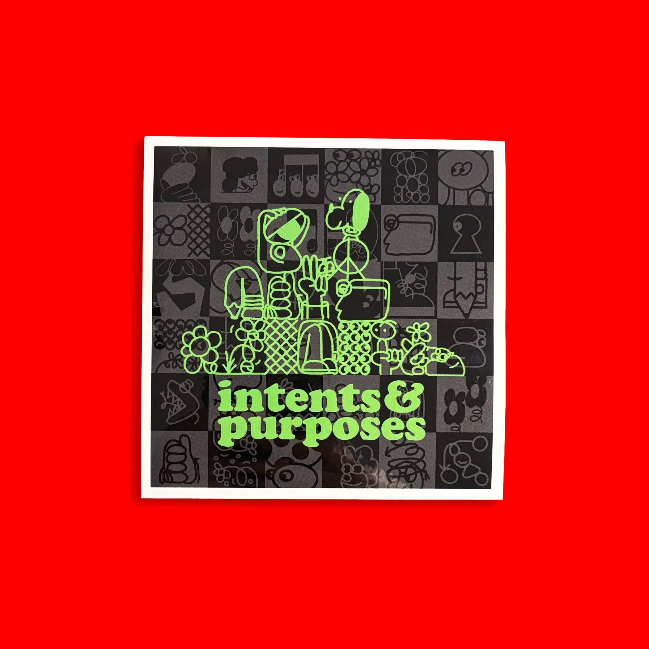 Vinyl sticker, die-cut. Intents & Purposes logo with characters, made to live on laptops, bottles, and sketchbooks. Approx 3 x 3 inches, square with rounded character silhouettes.