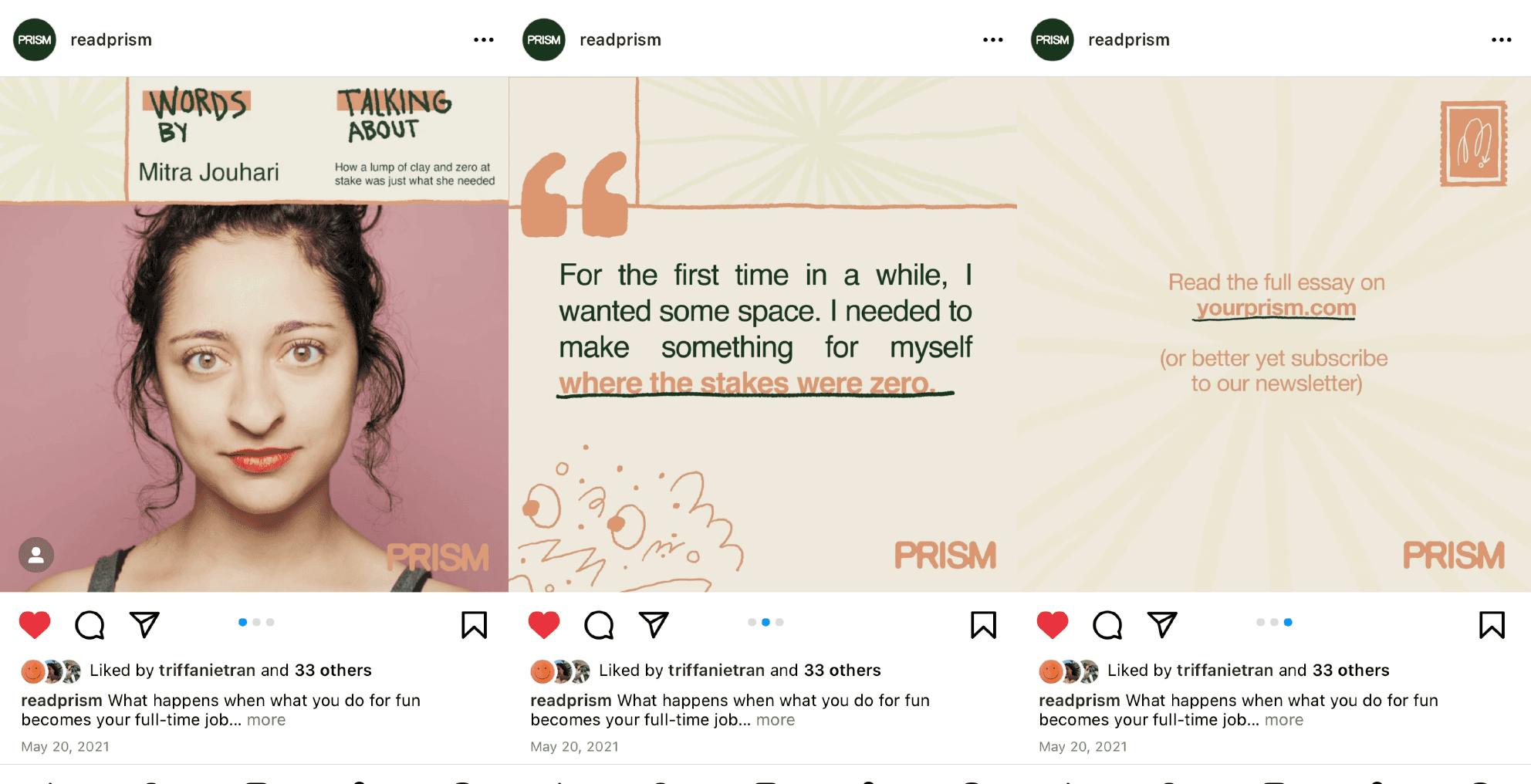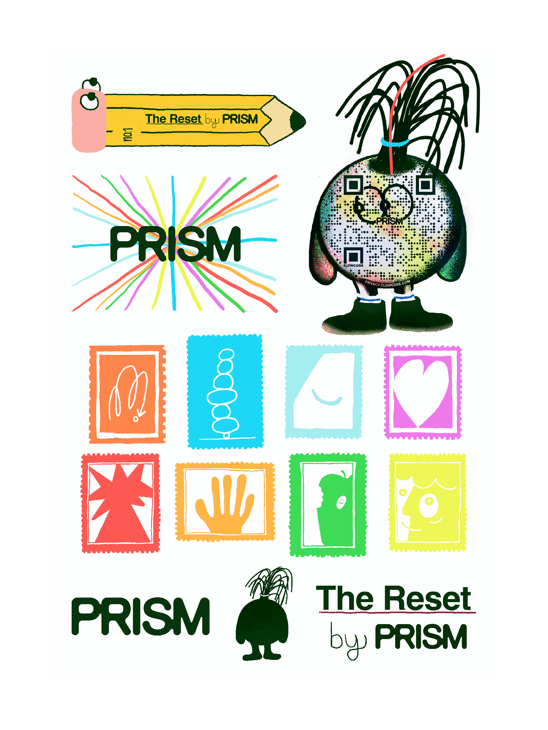 as part of the brand's early creative team, worked across visual touchpoints to help establish a look that feels thoughtful, human, and uniquely prism. work included merch design, illustrated typography, and a suite of assets for social and newsletter.