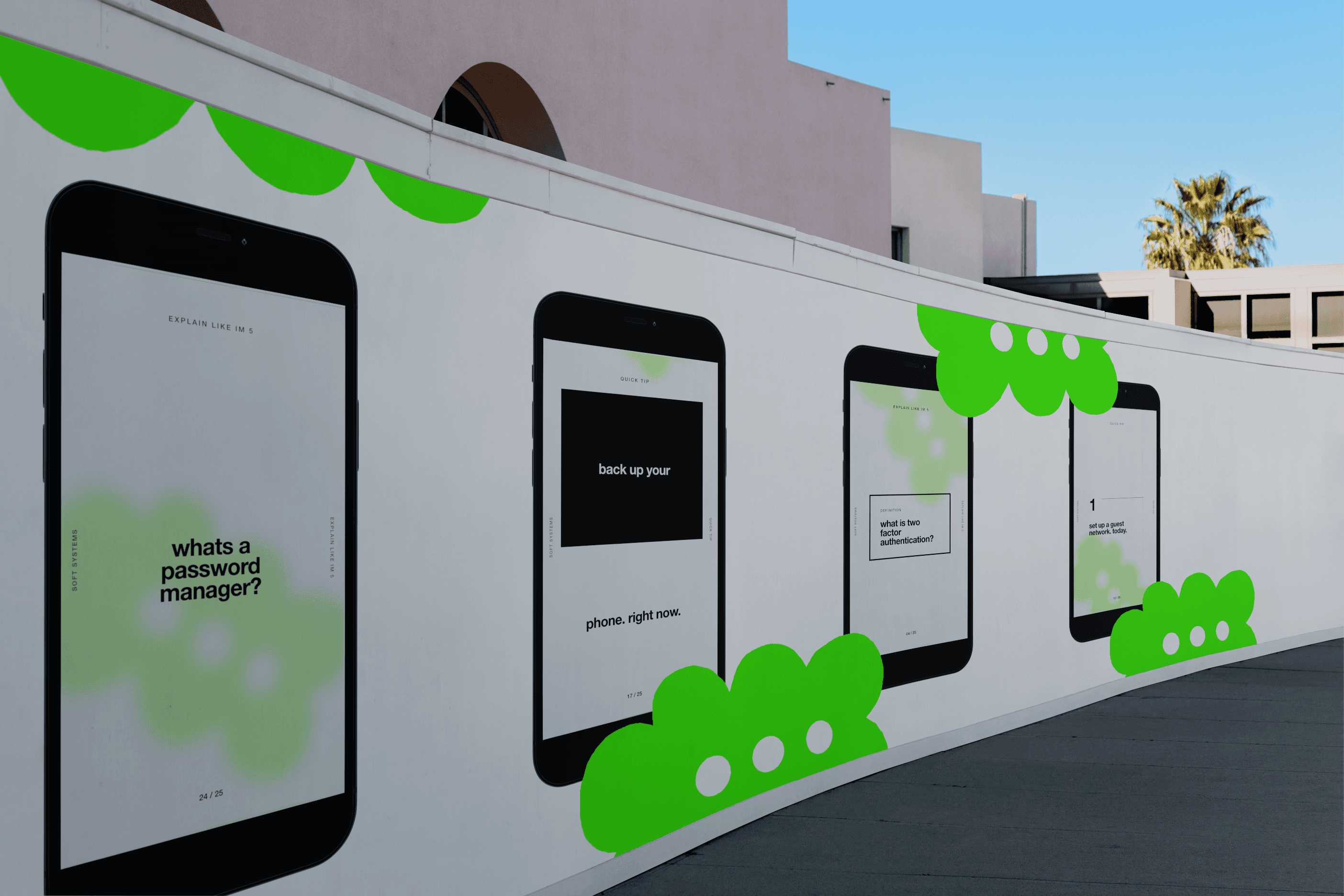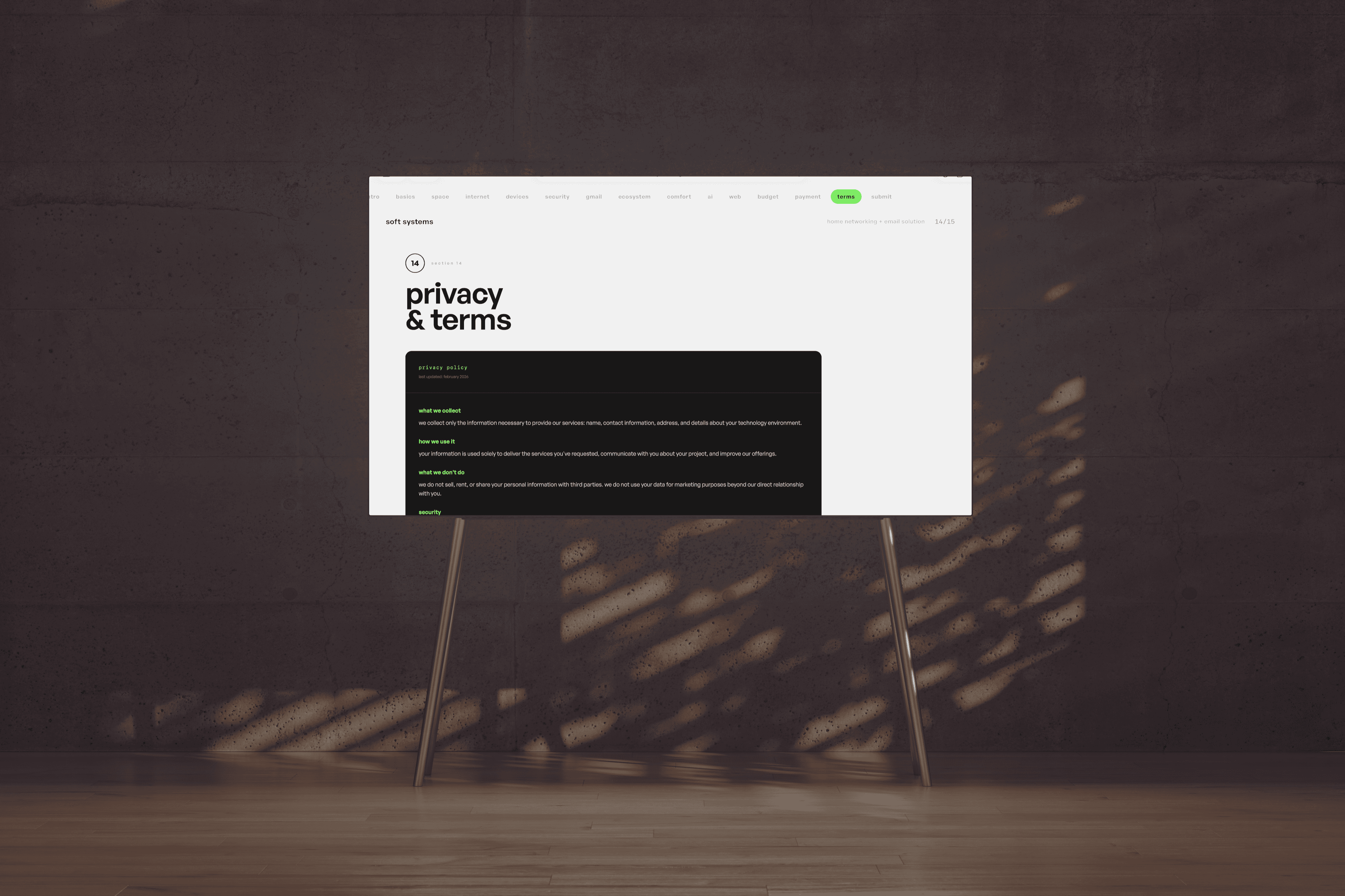 developed the brand identity, voice, and messaging system around the concept of digital hygiene. the idea that your tech needs regular care, not just crisis management. the visual language is minimal and typographic. designed to feel like a smart friend who happens to know DNS records. built the website and intake experience to reflect the same care soft systems brings to their client work. clear, documented, human.